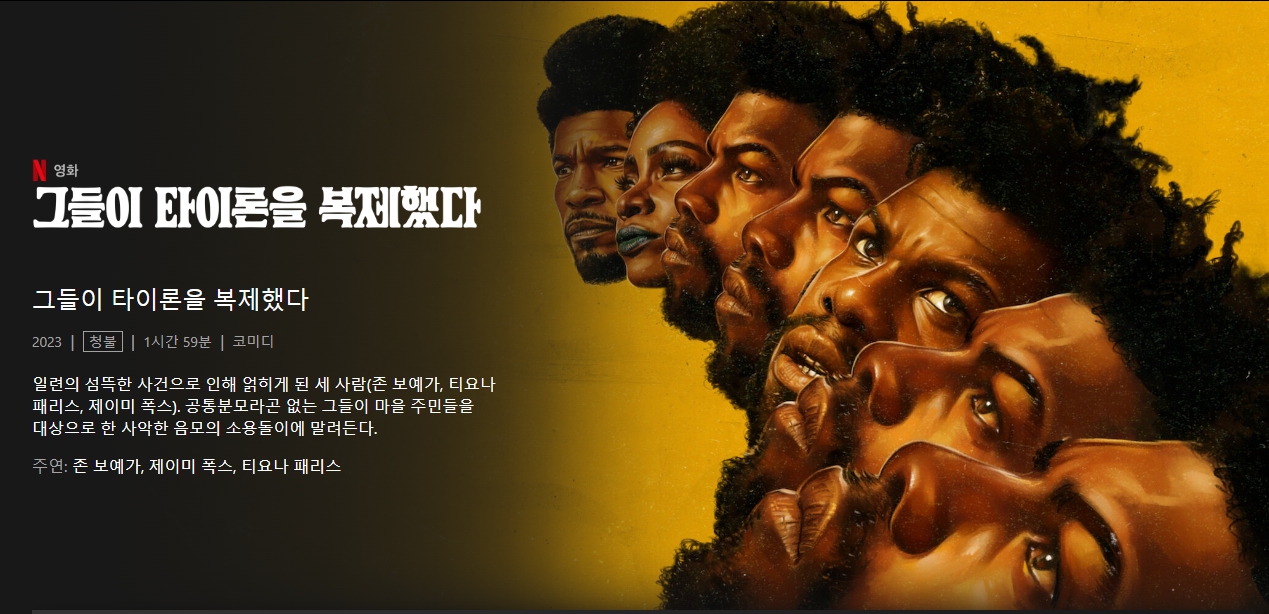 **Get Out(겟 아웃)**과 비교될 수 있는 영화로, 흑인 사회에 대한 날카로운 풍자와 미스터리 요소가 공통점입니다. 다만, They Cloned Tyrone은 좀 더 코미디에 중점을 두고 있습니다.